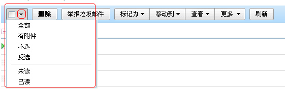 如果您想对当前页面中的少数邮件进行操作,请选中需要删除的邮件;如果您想全部选中本页的邮件,进入该文件夹后可直接点击功能栏最左侧的“复选框”按钮,此时,该按钮相当于全选;如果希望对当前页面中的多数文件进行操作,可点开右侧的下拉三角,进行更多操作的选择。