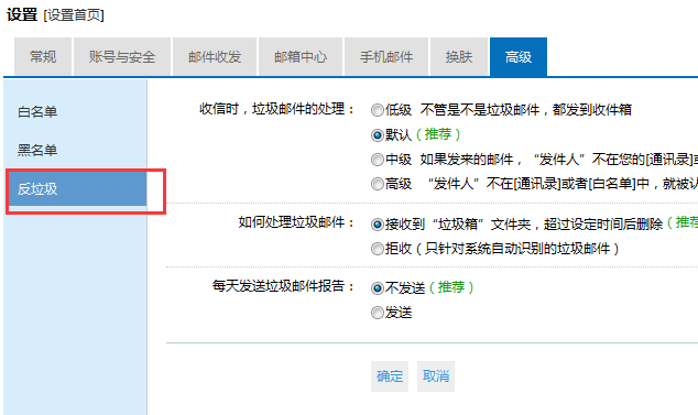 或者在收信前,对自己的邮箱进行反垃圾的设置,如下图: