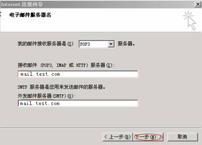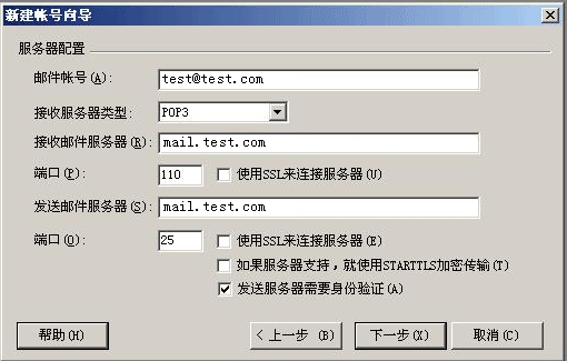 点击“下一步”进入“服务器配置”页面。这一步填写“POP3服务器”、“POP3帐户名”、“密码”及“SMTP服务器”。如果需要smtp验证,请在“我的服务器要求身份验证”前的复选框里打勾。