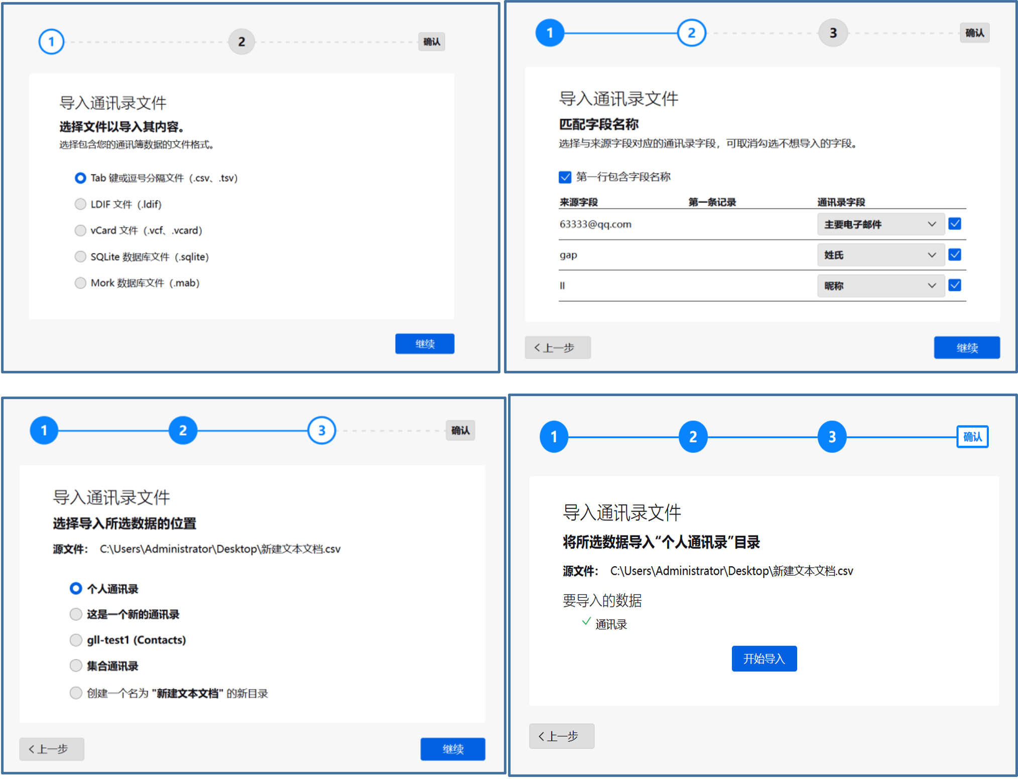 导入联系人:按照步骤选择文件格式和联系人数据文件,导入文件后选择字段匹配关系和要导入的通讯录选择完毕后点击【开始导入】,联系人数据将导入到选择的通讯录