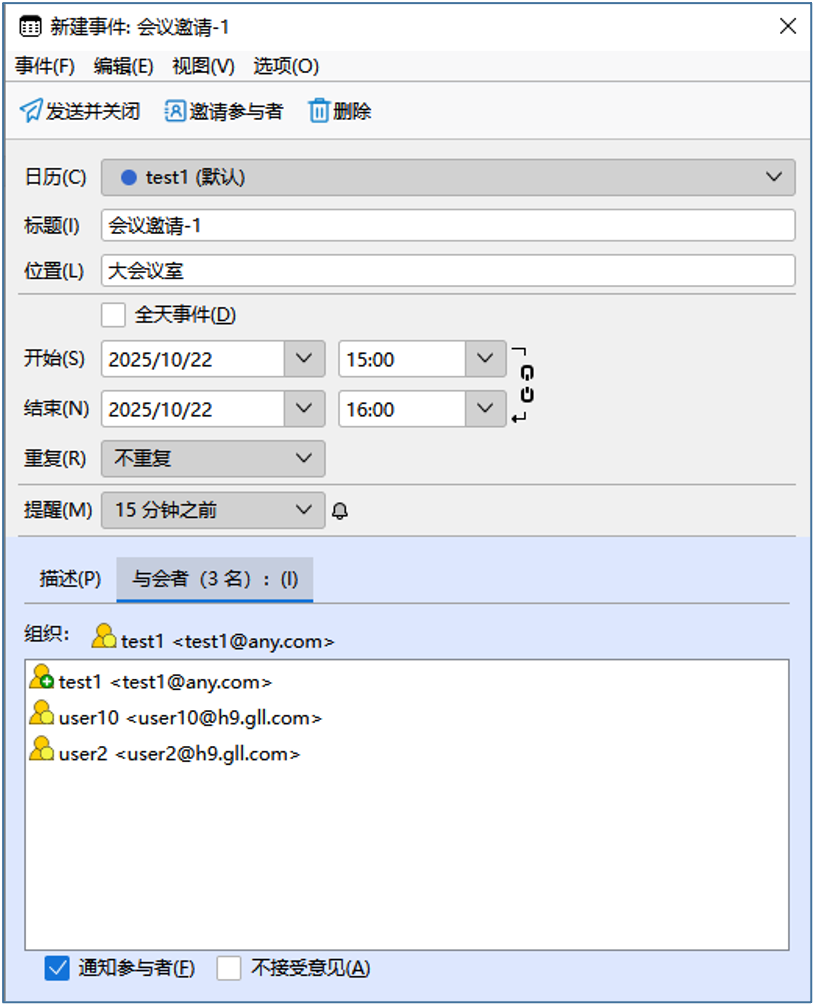 点击【邀请参与者】,打开邀请参与者页面,输入被邀请人邮件地址。输入会议信息后点击【发送并关闭】,会议邀请发送成功。被邀请人会收到会议邀请的邮件通知。