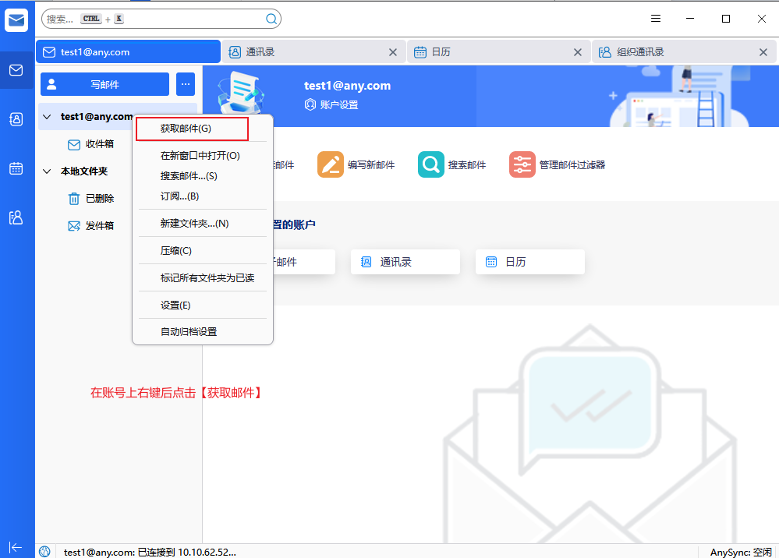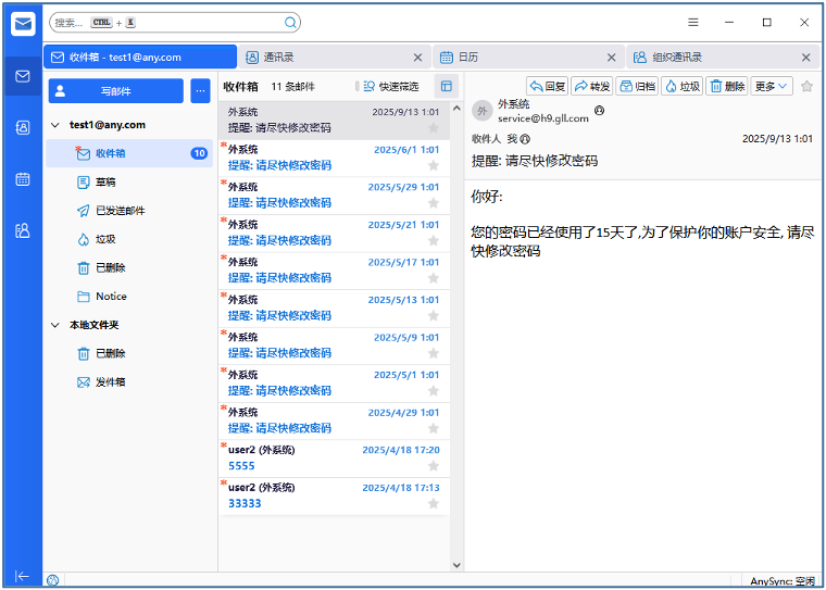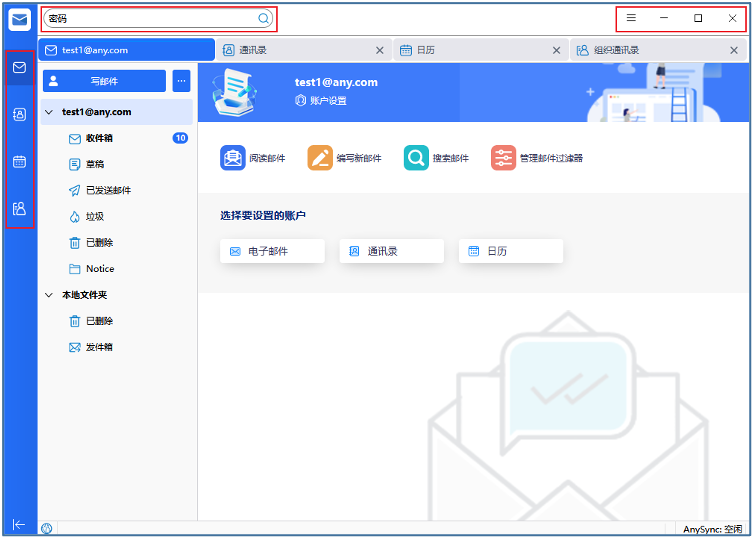 打开客户端后,显示客户端主窗口。左侧导航栏分别为:邮件、个人通讯录、日历、组织通讯录。顶部搜索框可对邮件进行快速搜索,右上角功能键。