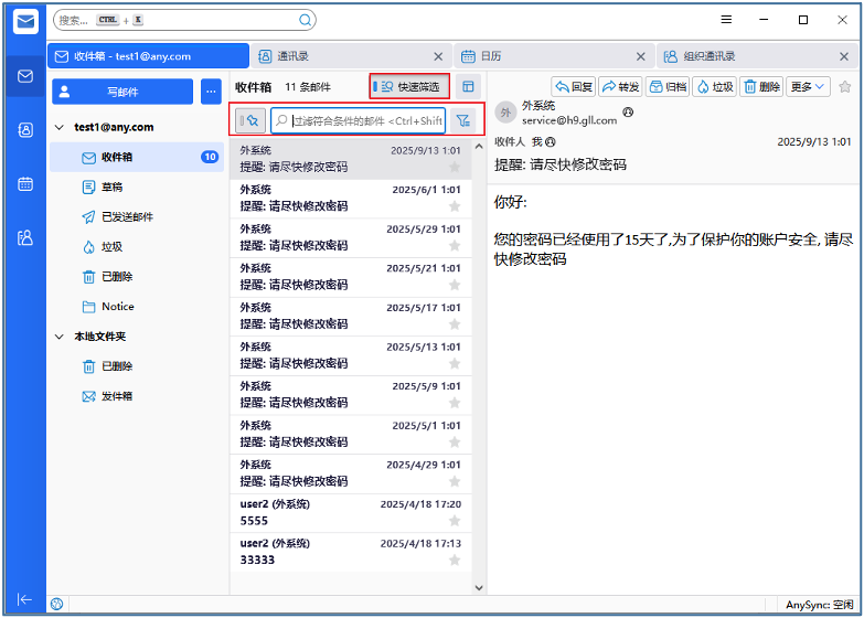 点击【快速筛选】可对邮件列表中的邮件根据条件进行筛选