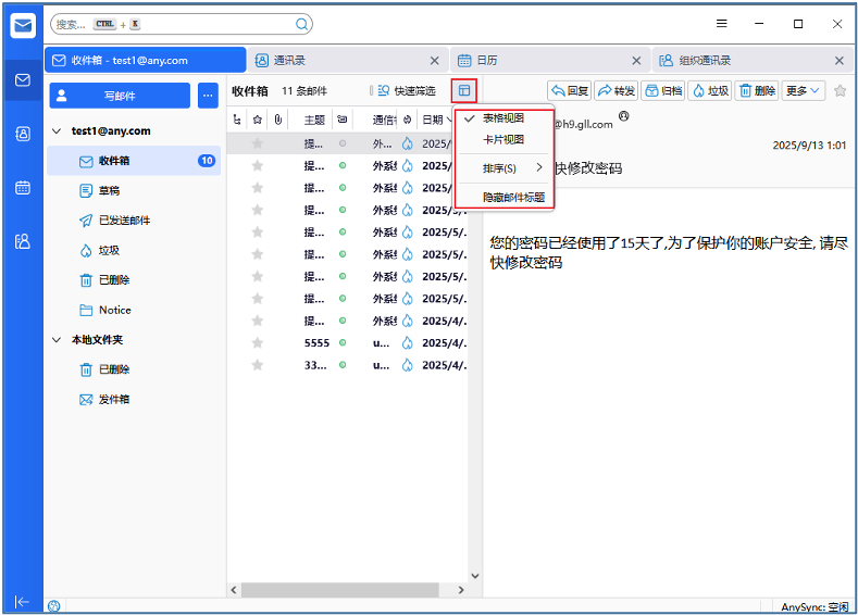 点击视图图标,可以选择邮件列表的显示方式和排序方式
