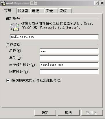 5.出现Microsoft Outlook设置窗口。在“常规”页中,分别设置相应的邮件信息。如图: