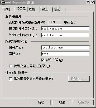 6.在“服务器”中分别设置邮件服务器的信息,如果需要smtp验证,请在“我的服务器要求身份验证”前的复选框里打勾。如图: