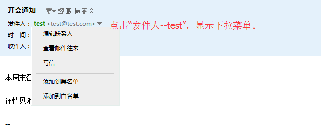 ②.如果您确认发信人地址是您的正常通信的邮件地址,请点击发件人地址,在弹出的列表中选择“添加到白名单”,使该邮箱地址加入白名单,之后该邮件地址发来的信可直接投递到您的信箱中。