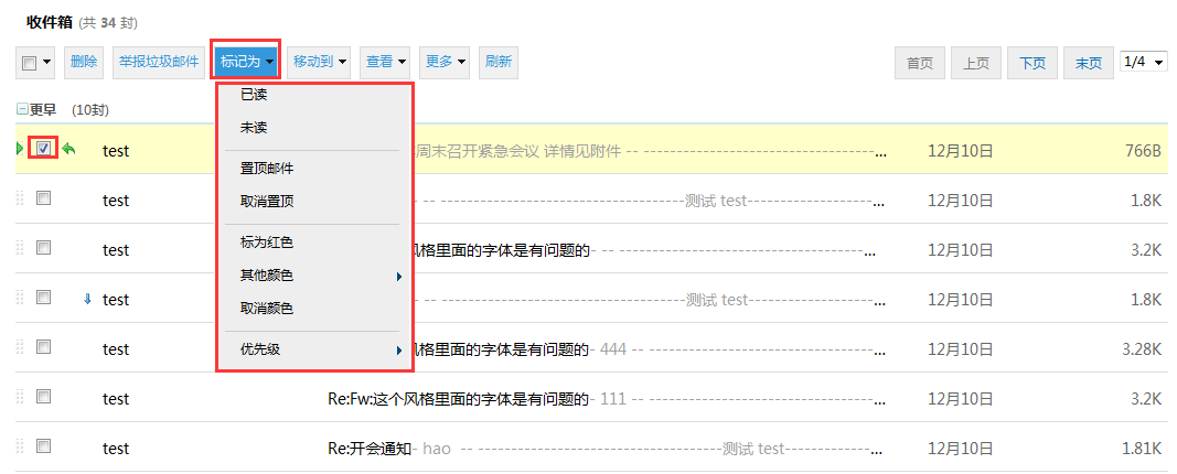 点击邮件列表页面右上角的快速过滤,可对邮件列表中的邮件按条件进行过