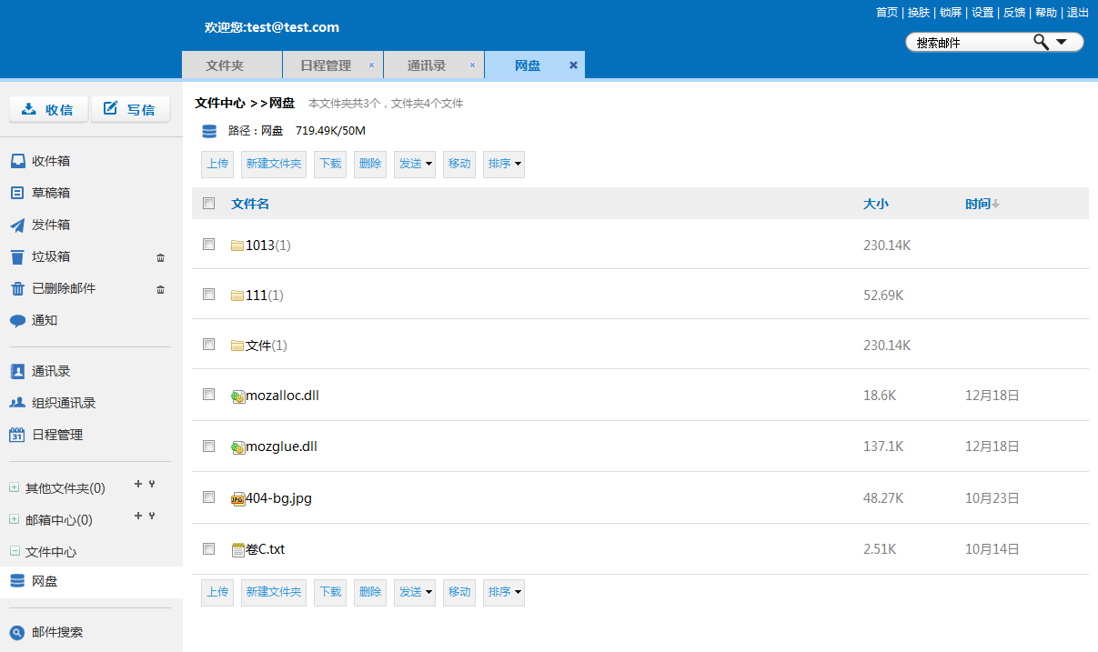 邮箱登录后默认页面,直观的显示了邮箱结构,首页的左边列出了收信、写信、各邮件夹、通讯录、日程、网盘、高级搜索。首页上边包括换肤、搜索、锁屏、设置、帮助、退出等。如下图: