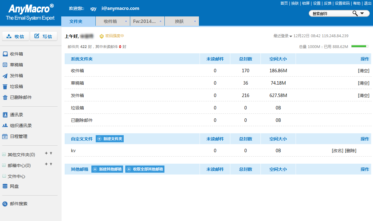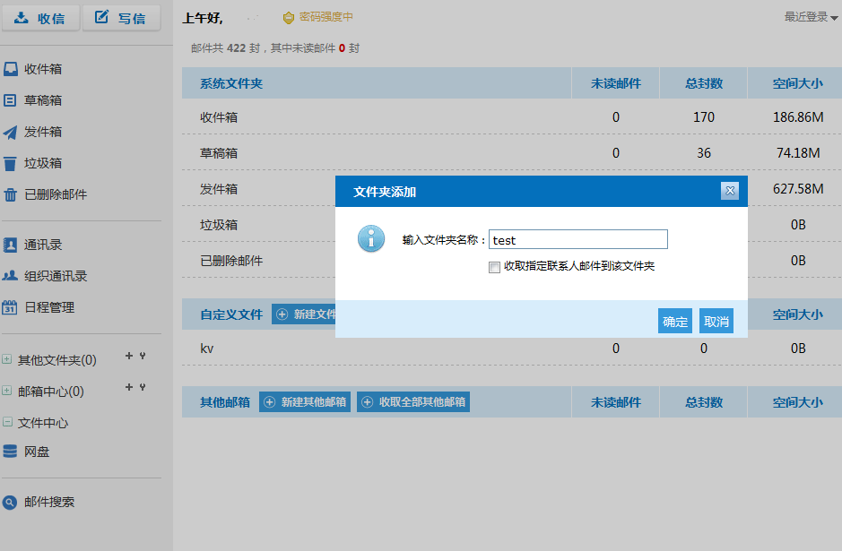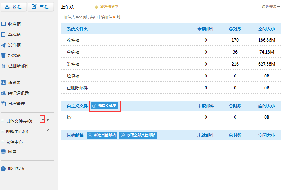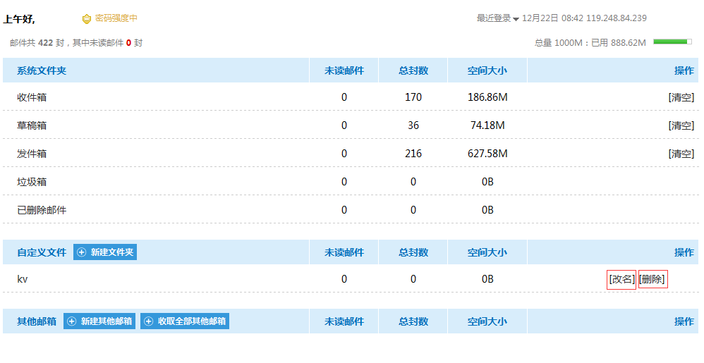 在这里可以清楚的看到邮箱的使用情况,包括邮箱总体容量和已使用容量以及单个文件夹下的邮件总数、未读邮件数、占用空间数等,有利于用户直观统计和合理运用空间。