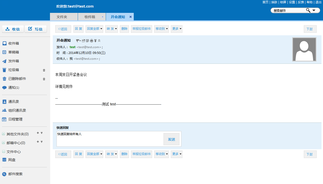 回复功能是对该信件的回复,这时,在发邮件时,收信人处将自动填入回复邮件的发信人的邮件地址,同时,回复邮件的正文将自动加入到邮件正文当中。如图: