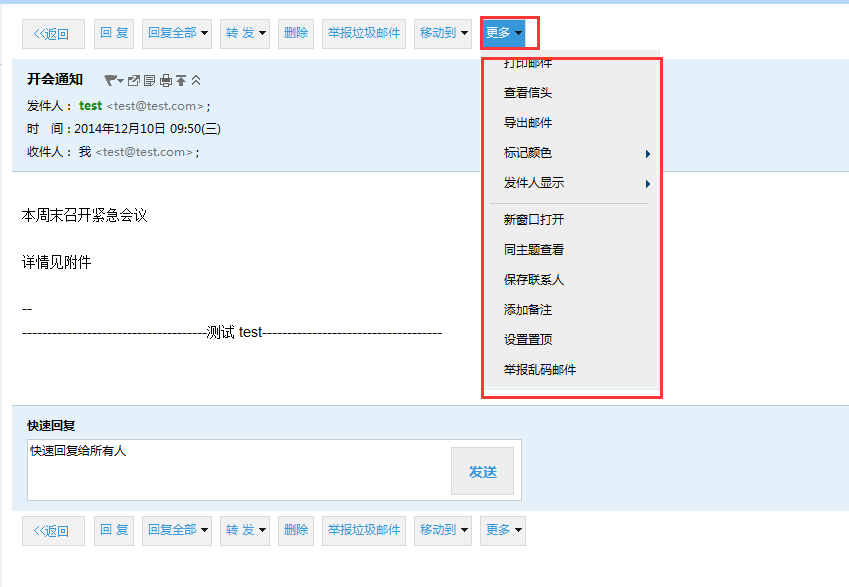 在打开文件的上方有“更多”这一栏,此时可以打印邮件、查看信头、下载邮件、标记颜色等。